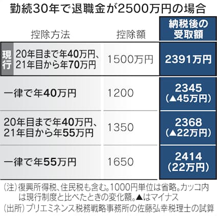 政府は終身雇用を前提とした退職金課税を見直す。試算によると、同じ会社で20年を超えて働く人が対象の税優遇がなくなれば、勤続30年で退職金2500万円を一時金として受け取る人は最大45万円ほど手取りが減る見込みだ。一時金と年金に分けて受け取れば影響は小さくなるとみられる。